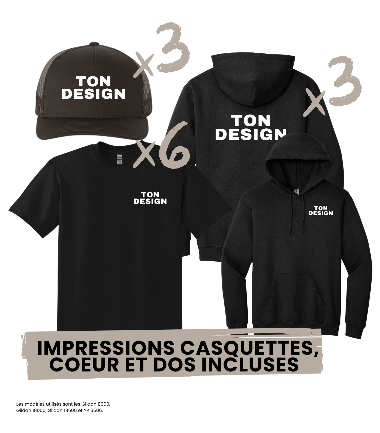 Tu choisis ton combo, tu téléverses ton logo et on s’occupe du reste.